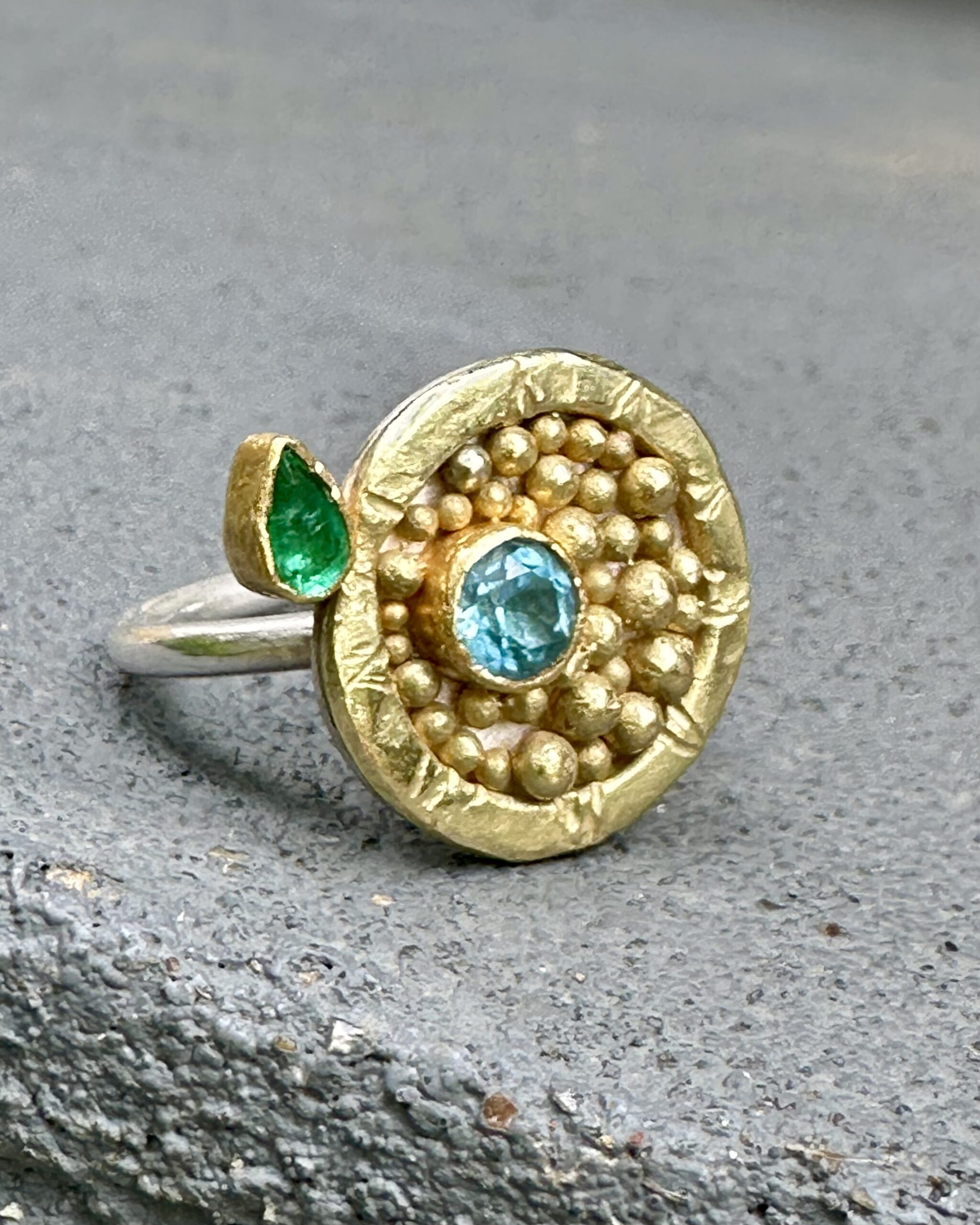 This one is one of kind and ready to go home. I made this one day as I looked around on at the gold dots sitting in a container on my bench. Inspiration just hit me. Made from 18k and sterling silver, with emerald and a swiss blue topaz set in a 22k gold bezel. Ring is a size 8.